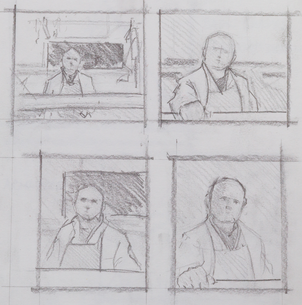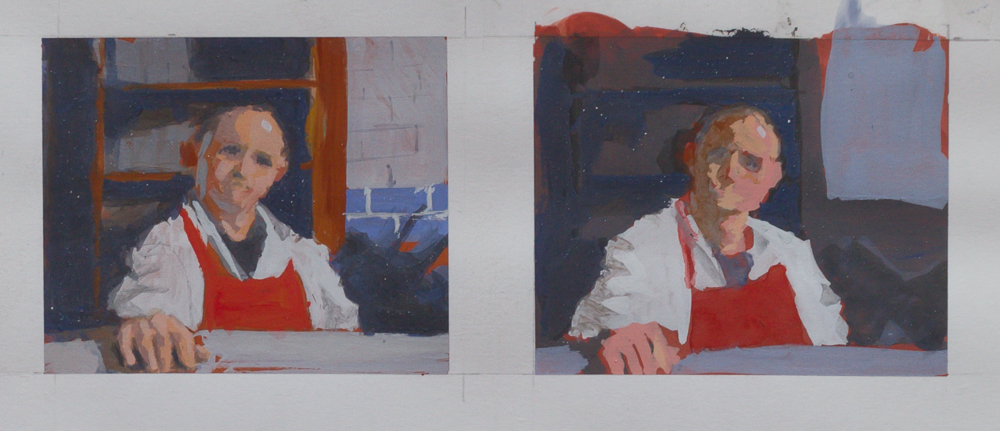 Bringing together the best of your initial ideas you’ll create a quarter scale compositional study for your final painting. The purpose of this is to get an overall idea of the finished piece but without out any detail. You’ll finalise your colour design and check that the overall idea is working properly. A study like this would be used to demonstrate your idea to a client if you were working to commission.